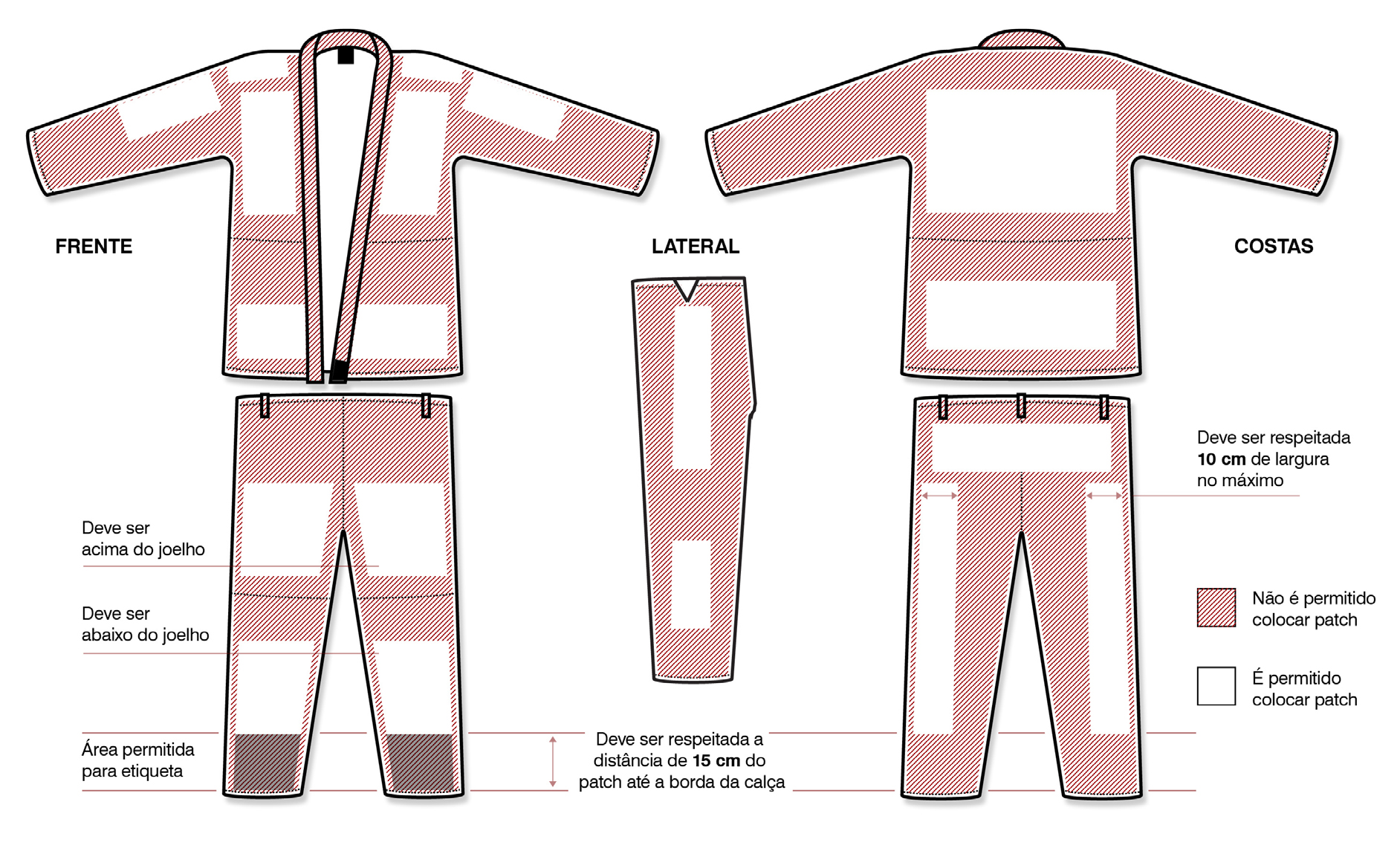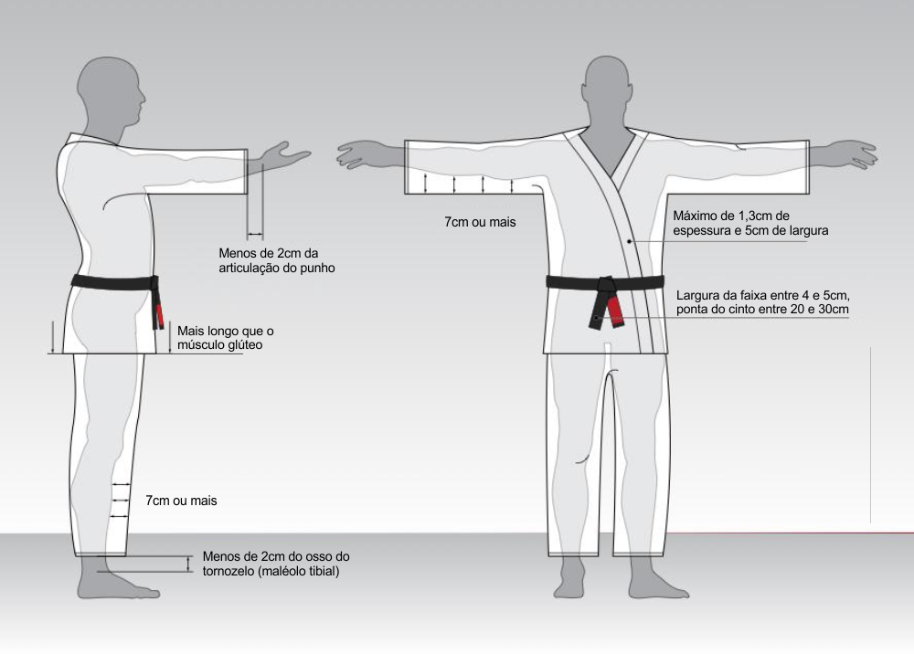 O paletó deve ir até as coxas do atleta e o comprimento mínimo das mangas deve alcançar até 2 cm da articulação dos punhos dos atletas quando os braços estiverem esticados para frente paralelo ao solo.A calça do kimono deve ter comprimento mínimo de 2 cm acima do maléolo tibial (osso do tornozelo).