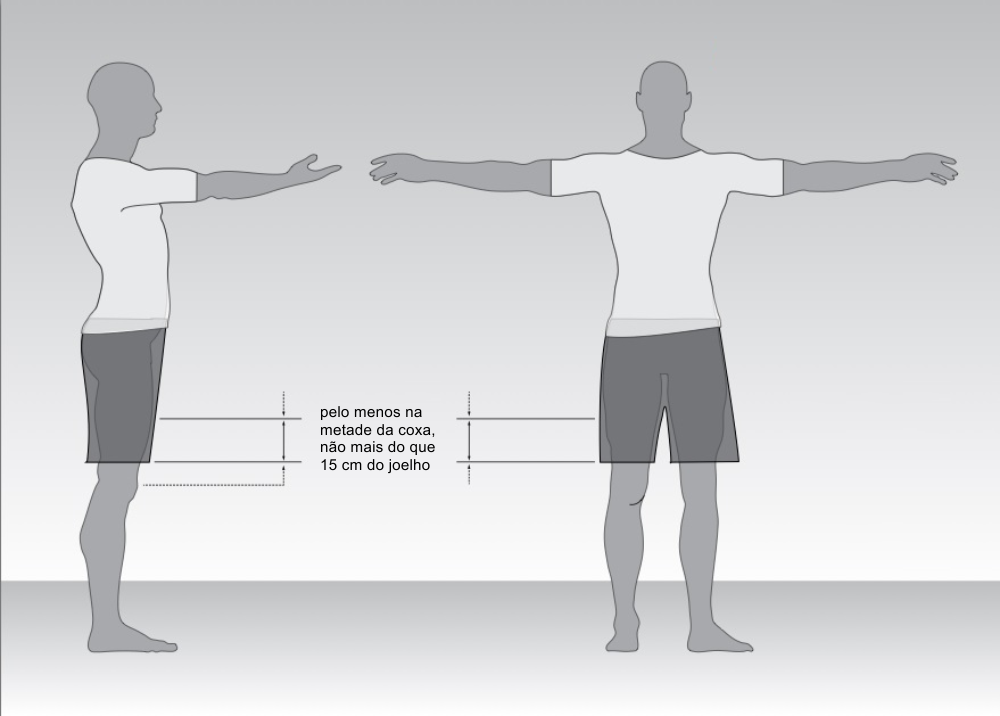 Para ambos os gêneros deve ser usado camisa de tecido elástico (colado ao corpo) com comprimento que cubra a linha da cintura da bermuda, de cor preta, branca ou preta e branca, e com pelo menos 10% na cor referente à graduação (faixa) a que o atleta pertence. Camisas 100% na cor da graduação (faixa) a que o atleta pertence também são aceitas.Obs.: Para as categorias de faixa preta será́ tolerado uma pequena área na cor vermelha, mas sem descaracterizar a cor da graduação do atleta.